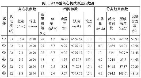 2010年10月底,公司選用麗水市恒力離心機(jī)械設(shè)備有限公司的LW350A型臥螺離心機(jī)對循環(huán)水污泥進(jìn)行了定性試驗,LW350A型離心機(jī)的主要參數(shù)為:螺旋差速10~30r/min、轉(zhuǎn)鼓轉(zhuǎn)速2800r/min、電機(jī)功率55kW。絮凝劑選用濃度為1.5‰的陰離子型聚丙烯酰胺,試驗數(shù)據(jù)見表1。